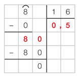 - Il 16 nell'8 ci sta 0 volte con resto 8: scrivi 0 al quoziente e metti la virgola.