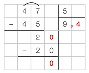 Esegui la divisione come con i numeri naturali; ricorda di mettere la virgola al quoziente quando abbassi la prima cifra decimale.